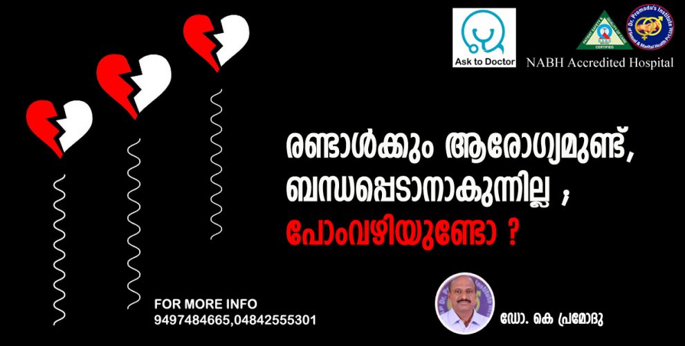 EXPERT OPINION : ലൈംഗീകബന്ധത്തില് ഏര്പ്പെടാന് കഴിയാത്തതിന് കാരണങ്ങള് പലതാണ്. ഭര്ത്താവിന്റെ ഉദ്ധാരണക്കുറവ്, ശീഘ്രസ്ഖലനം, സ്ത്രീയുടെ ഭയം, യോനീസങ്കോചം, ഇരുവരുടെയും അജ്ഞത, തെറ്റായ പൊസിഷനുകള്, ആത്മവിശ്വാസക്കുറവ് ഇങ്ങനെ പല കാരണങ്ങളുണ്ടായിരിക്കാം. ഭയക്കേണ്ടതില്ല , ഇതിന് നൂറു ശതമാനവും ഫലപ്രദമായ ചികിത്സയുണ്ട്.